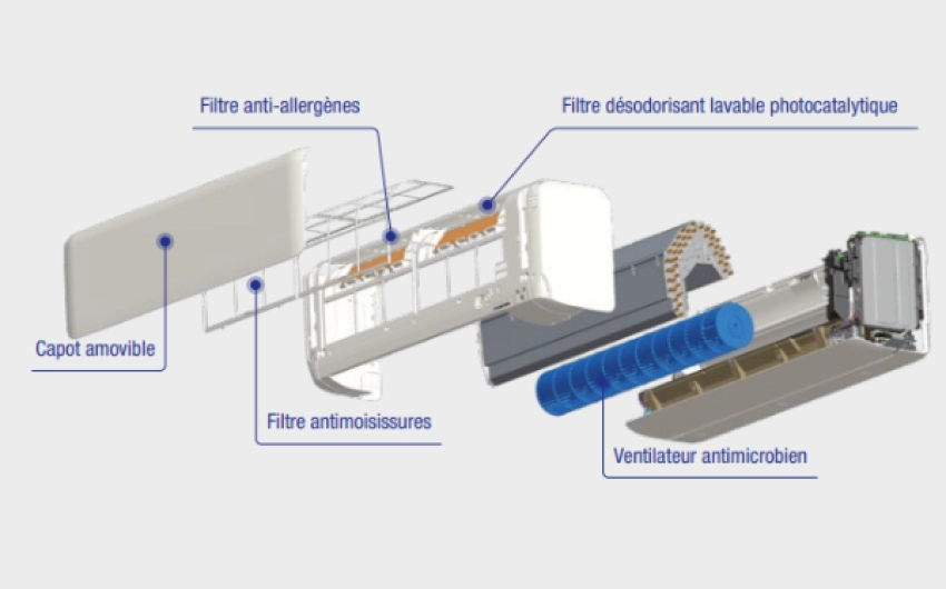 Le ventilateur a bénéficié d’un traitement antimicrobien pour éliminer moisissures et germes, de manière à conserver un système propre et sûr. Ce traitement permet d’éviter les mauvaises odeurs, les moisissures qui peuvent se développer lorsqu’un appareil a une période d’arrêt prolongée.(présent sur toutes les unités murales.)