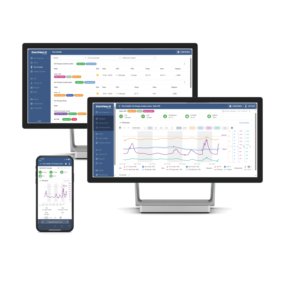 La gamme DomNexX DIAGNOSTIC est constituée d'un kit de diagnostic DiagAir, contenant 5 capteurs avec écran connectés à la plateforme web de suivi. Les capteurs sont mobiles & peuvent être utilisés en simultané pour optimiser les temps de chaque mesure.