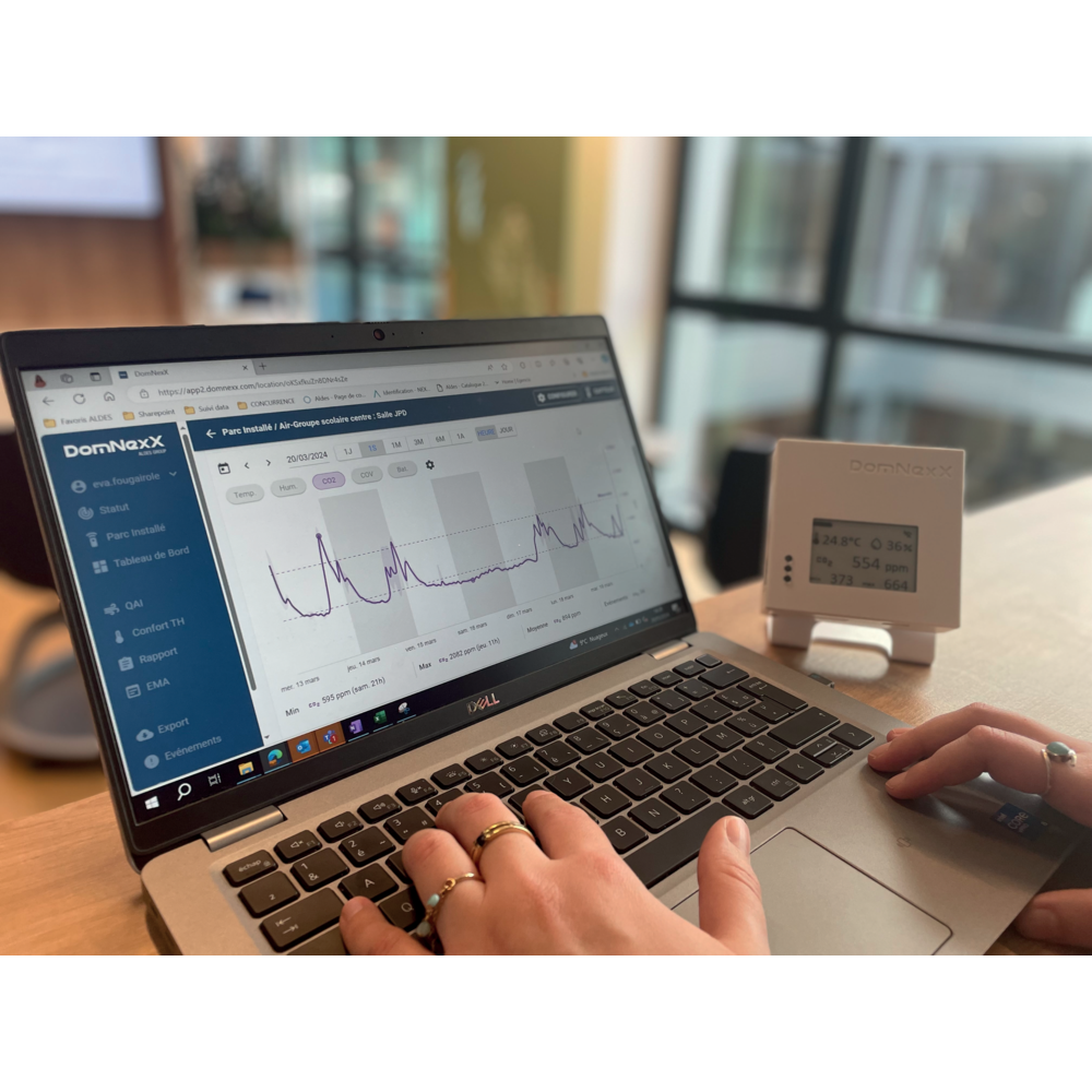 Le capteur DomNexX mesure la température, l'humidité, le CO2 et/ou le COV dans les salles.